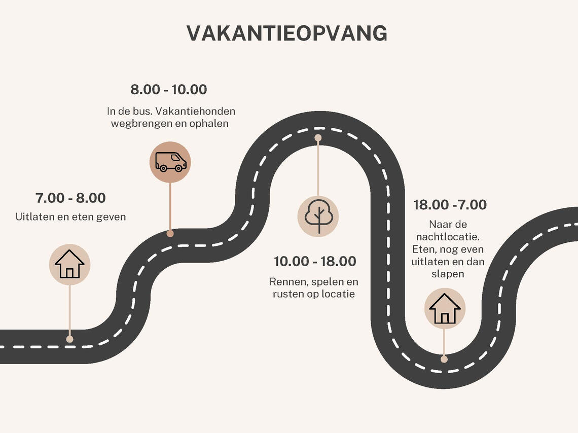 Wij halen uw hond rond 08.30 uur op en brengen hem of haar in de namiddag weer thuis.Voor de dagopvang in het weekend staan er standaard vijf plekken open.Het tarief is €32,50. Voor een tweede hond uit hetzelfde gezin geven wij 10% korting.